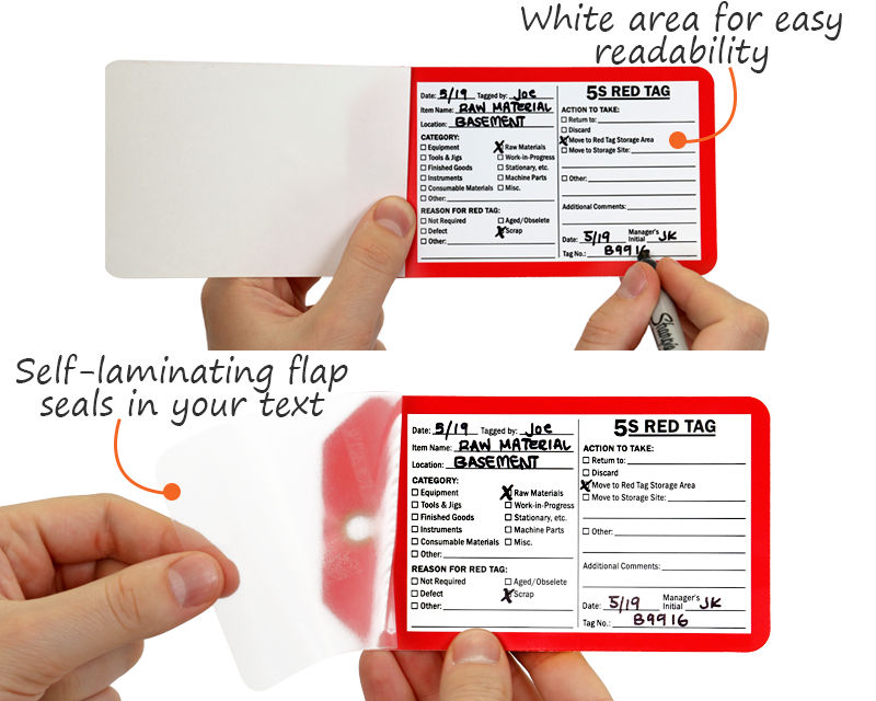 The 5S Red Tag System eliminates clutter and creates a clean and tidy work area where everything is organized, near-by, and easily accessible. Our 5S Red Tags aid in executing the five essential criteria: Sort, Straighten, Shine, Standardize, and Sustain. This helps increase workplace productivity and reducing the waste of motion associated with looking for tools, equipment, materials, or information.