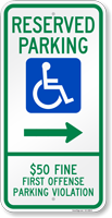 Alabama ADA Handicapped Parking Sign: Reserved Parking, $50 Fine for First Offense Parking Violation with Symbol (Choose Arrow) K2-1205-R Learn More...