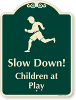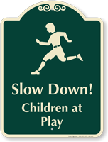 Use this signature sign to mark the playground area for children and inform drivers to slow down while passing through.