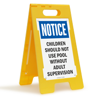 FloorBoss Signs consist of an A-frame made of durable, injection-molded plastic. This plastic is lightweight polypropylene with reinforced ribbing for extra strength. This frame also has an easy-grip handle on the top. You also get two thick plastic message panels with this self-standing frame. These panels printed with your “Adult Supervision Required” message fit into each side of the frame for a double-sided view. Panels can be permanently locked into place (with included rivets) or can be swapped out modularly.