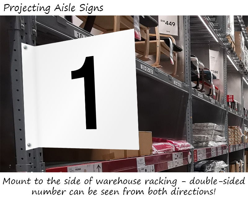 These are signs used to identify aisles and rows. They are typically hung from the ceiling, mounted on racks, or stick out from the shelf. You can find specialized versions in our warehouse aisle signs category.