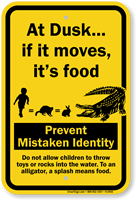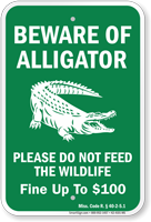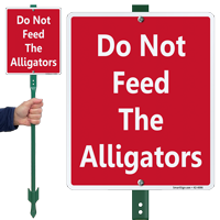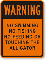 Common messages include "Danger - Alligators," "Do Not Feed Alligators"" and "No Swimming." "Do Not Feed" is critical because feeding causes gators to lose their fear of humans.