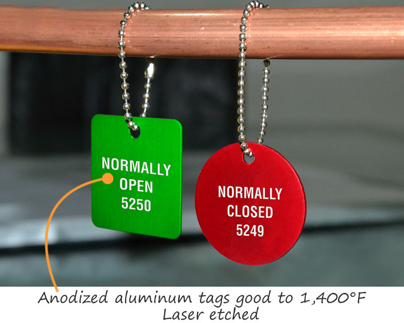 No. Aluminum valve tags are 50 mil thick, which is thicker than a US dime but thinner than a quarter. Plastic valve tags, on the other hand, are 60 mil thick. Plastic tags tolerate temperatures up to 170°F. In both types, the print is engraved, allowing the text to stand out against the contrasting core color.