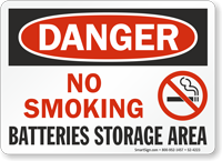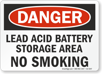 The process of charging industrial lead-acid batteries releases hydrogen gas, which is highly flammable and can accumulate in enclosed spaces. A No Smoking / No Open Flames sign is a critical fire code requirement to prevent accidental ignition. An explosion in a battery room can cause catastrophic damage and severe chemical burns to personnel.