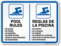 Common messages include "no diving" / "no clavarse," "no lifeguard on duty" / "no hay salva vidas presente" and "pool rules" / "reglas de la piscina." you can also find signs specifically in spanish.