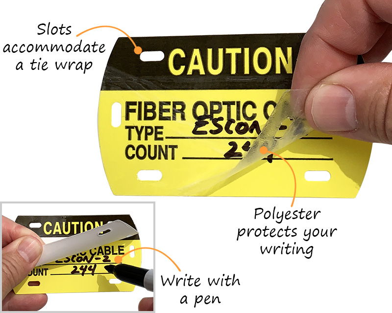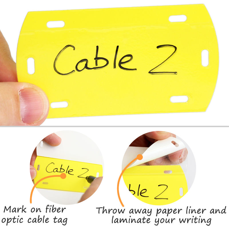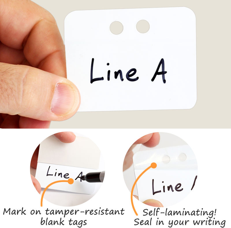 Self-laminating tags come with a clear adhesive film that sticks to the writable/printable surface and protects the text from weather and abuse. The laminate is either made of clear polyester or polypropylene and ensures your tag remains useful for a long time.
