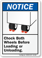 Per OSHA 1910.178, chocks prevent trucks from rolling away during loading. You can find these mandatory markers in our chock wheels signs collection.