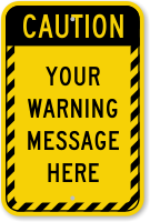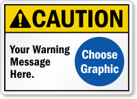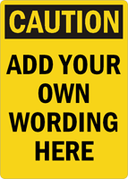 A custom caution sign uses the standard yellow OSHA/ANSI caution header but allows you to write your own text. It is used for hazards that could cause minor injury or to warn against unsafe practices. You can design one using our custom signs tool.