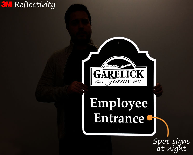Yes. Our Custom Designer Metal Signs are available in 3M reflective aluminum. 3M’s High-Intensity reflective surface makes the sign visible in the dark and helps meet DOT requirements for parking lots too. These elegantly shaped signs are also available in non-reflective versions.
