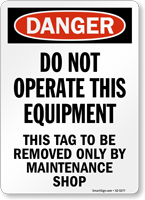 We offer a comprehensive line of do not operate machinery warning signs for posting on or around equipment during maintenance, inspection, or repair. Signs are made from durable plastic and heavy-duty aluminum - resistant to high temperatures, chemical spills, fading, and abrasion - and most comply with OSHA and ANSI sign design specifications. Signs with and without pictograms are available.