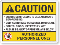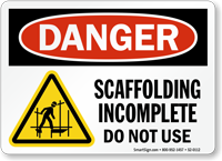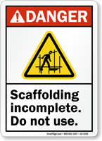 An Incomplete Scaffold sign means the scaffolding is still being erected or dismantled. It is not yet safe for its intended work and should not be accessed by anyone other than the erection crew. These are similar to other no admittance signs that restrict access to unfinished areas.