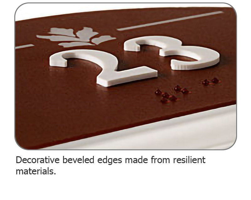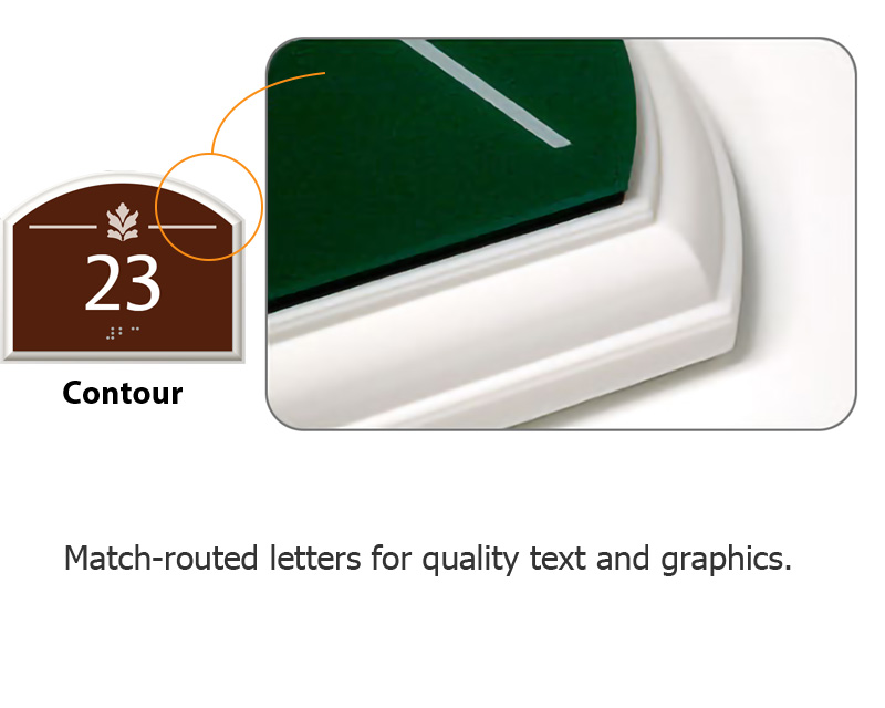 A striking appearance and incredible durability makes our Contour Sign Series a cut above the rest. Classic beveled edges along a sturdy 3/8" thick plate exceeds ADA regulations, with FirstTouchâ„¢, baked-on ceramic Braille.