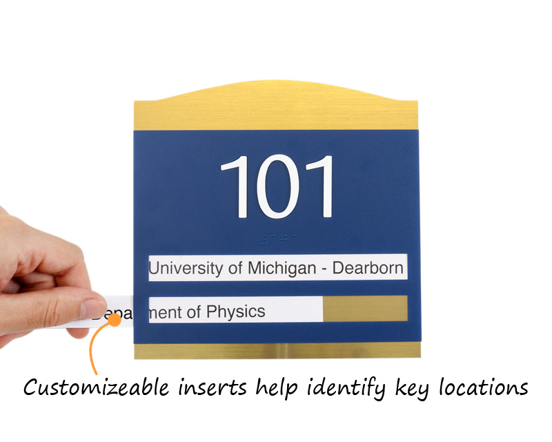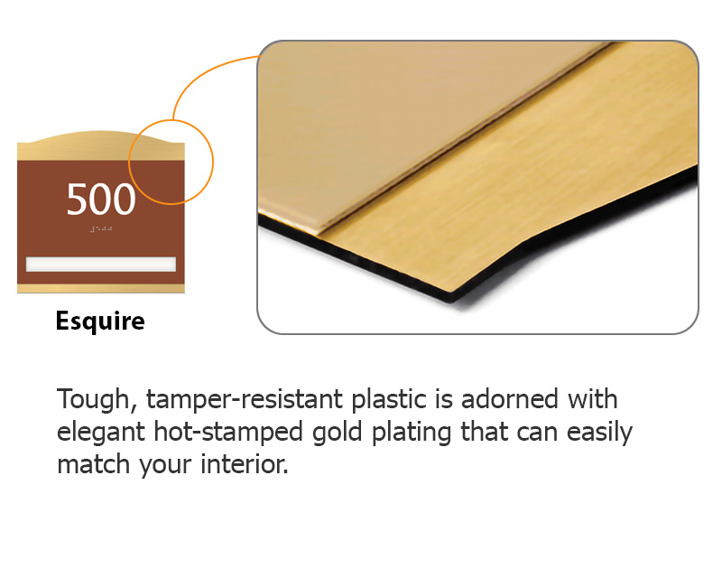 Our Esquire Office Door Signs boast elegant style with a touch of gold. Brushed gold accents are heat-stamped for a flawless design that accents any interior. We offer these in 20 color options, ensuring your facility's signage needs are met.