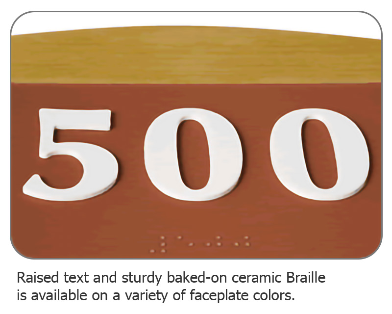 • • Raised white characters and Grade II Braille for permanent room signs comply with the Americans with Disabilities Act (ADA).
