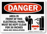 • • Do Not Block Electrical Panel Signs, Electrical Panel Keep Clear Signs - OSHA section 1926.403 clearly indicates to keep a minimum clearance of 30" to 48" around the electrical panel.