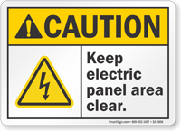 • • Do Not Block Electrical Panel Signs, Electrical Panel Keep Clear Signs - OSHA section 1926.403 clearly indicates to keep a minimum clearance of 30" to 48" around the electrical panel.