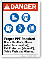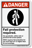 Posting our fall protection required danger sign and other options from our fall protection signs collection at elevated work areas documents that the employer identified the fall hazard and communicated the PPE requirement to workers, demonstrating due diligence in OSHA inspections and liability cases with durable laminated construction that maintains a clear continuous record of the posted requirement throughout the project.