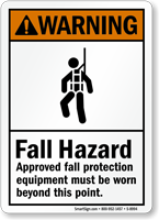 A compliant fall protection sign should state that appropriate fall protection equipment must be worn, specify the required PPE, and use a Danger or Warning header matched to the fall hazard severity, and our fall protection required OSHA danger sign and fall protection required beyond sign use OSHA and ANSI-compliant language with the fall protection required symbol for immediate compliant posting.