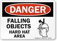 A "Falling Materials" sign warns of a specific, immediate overhead hazard, while a "Notice: Hard Hat Area" sign defines a broader zone where head protection is mandatory at all times. We recommend using both: the "Hard Hat Area" sign at all entrances to the site, and the "Falling Materials" sign directly below the specific work area.