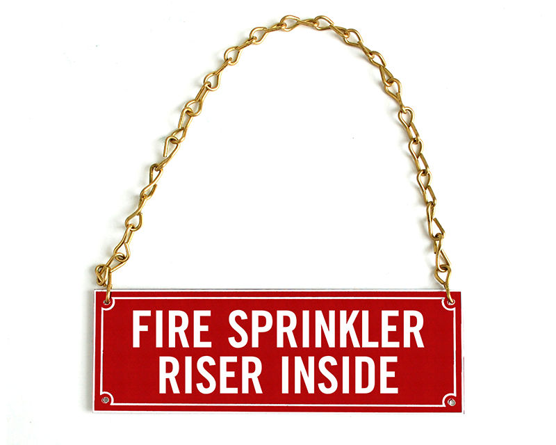 Our fire riser signs are available in aluminum, reflective adhesive labels, and photoluminescent formats for quick identification of sprinkler riser rooms and system components, and can be door-mounted, wall-mounted, or hung directly from riser systems with a chain for mechanical rooms, closets, and utility spaces.