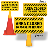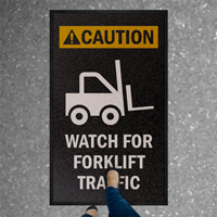 We use these signs, with arrows to indicate direction of forklift traffic, to alert team members that they are about to step into a traffic lane. The signs are high visibility and readily seen by those on foot. The only issue we have had with the signage is that the wording gets worn off with constantly being run over by forklifts. Foot traffic has little effect on the signage.