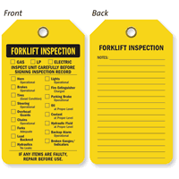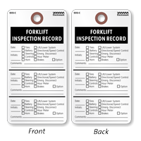 OSHA standard 29 CFR 1910.178(q)(7) for powered industrial trucks requires that all forklifts be inspected daily before being placed in service or after every shift when used on an around-the-clock basis. Our popular Forklift Checklist Inspection Tags aid in confirming that every system is carefully reviewed – prior to operation.