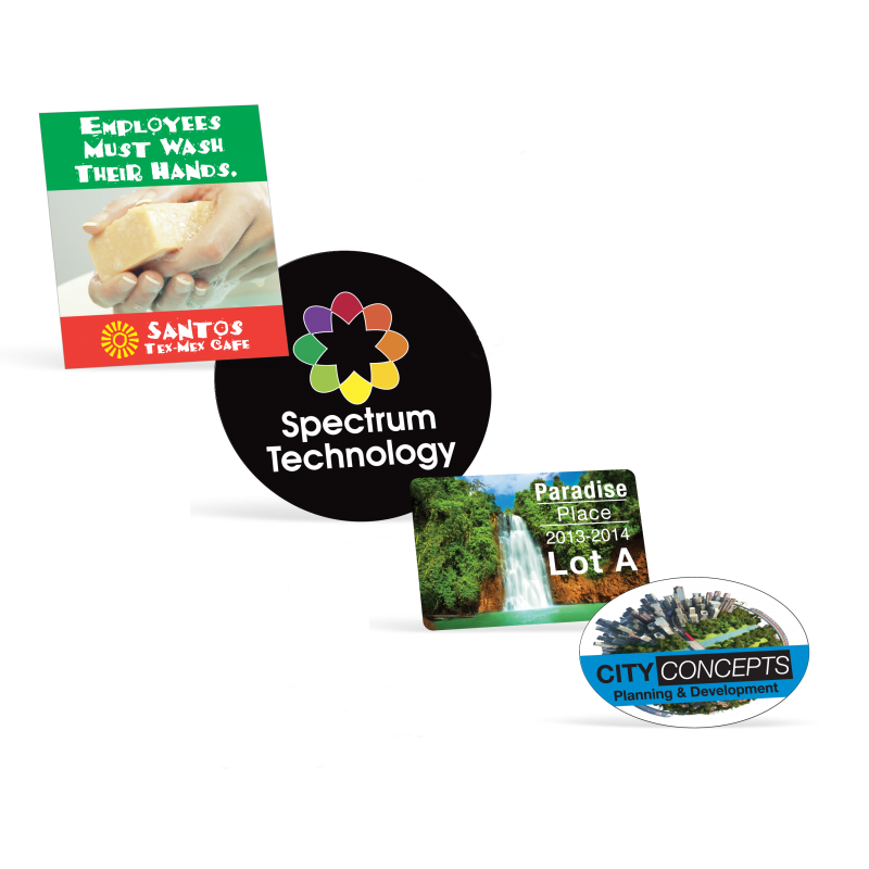 • Material options include vinyl, polypropylene, static cling, and of course, paper. Choose from different grades of adhesive, including permanent and removable.