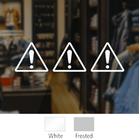 • • Available in white or frosted vinyl, each sticker includes a bold awareness symbol and message such as “Watch Your Step” or “Sliding Door – Stand Back.”