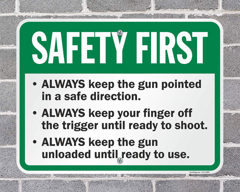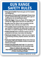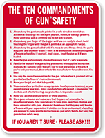 Shooting ranges typically need signs covering firearm handling rules, hearing protection requirements, eye protection, range commands, and general firearms safety guidelines, and our gun safety sign collection covers all standard range requirements including our ten commandments of gun safety sign for the most widely referenced shooting safety rules.