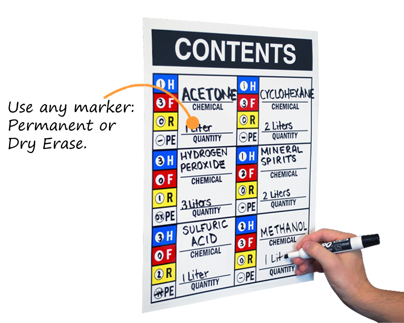 Magnetic Chemical Labels save you the hassle of installation - they easily stick to steel or metal surfaces. Mention chemical contents with these bold, self-adhesive RTK labels. Give hazard ratings through NFPA Diamond or HMIS pre-printed on the labels. These write-on labels help your staff keep track of the chemicals and their quantities stored in cabinets or other storage units in your facility.