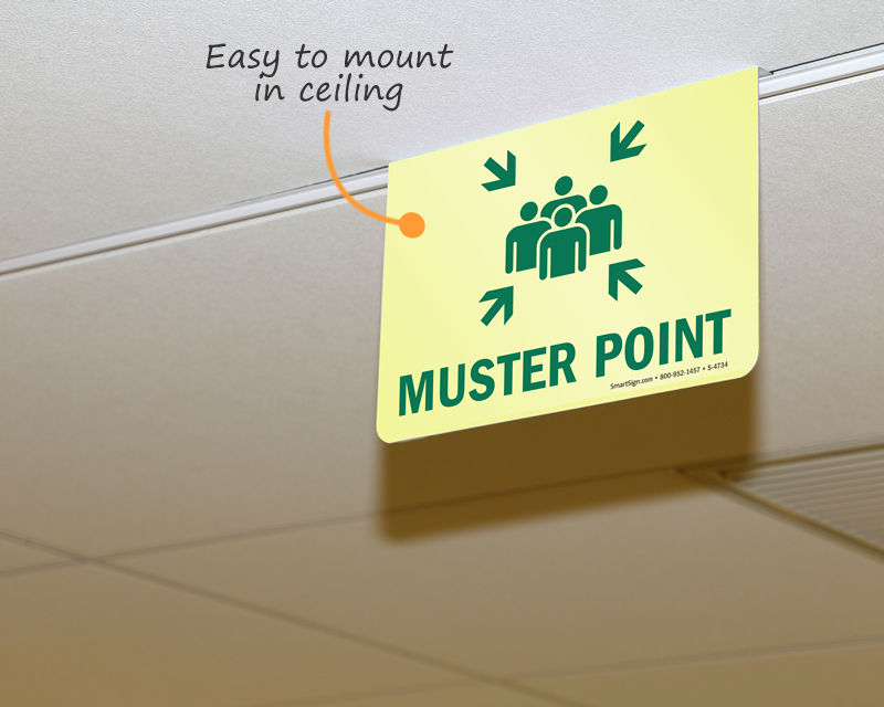 Muster point signs direct all guests and employees during an emergency. Post signs for your thoughtful and prepared evacuation plan.