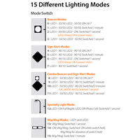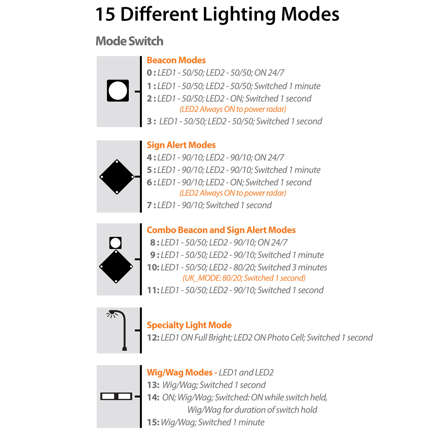 - Modes: Beacon Mode, Sign Alert Mode, Combo Beacon and Sign Alert Mode, Specialty Light Mode, Wig/Wag Mode