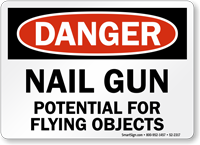 Nail Guns Safety Signs alert residential carpenters and other workers using nail guns to be safe from flying objects and other hazards in the vicinity. Residential home builders, construction contractors, subcontractors, and supervisors must ensure they post warning signage and train workers for safe practices. Signs prompt them to wear adequate personal protective equipment.