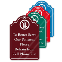 Hospitals and other health care centers demand a tranquil and orderly environment for everybody’s comfort. No Cell Phone Signs in health care centers help people comply with the rules, while maintaining a polite tone.