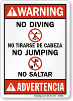A. Our collection of “No Diving” signs has something to meet every requirement. We offer “No Diving” signs in English, Spanish, and English+Spanish (bilingual signs). You may choose from standard and designer options, or maybe create a custom sign in no time!