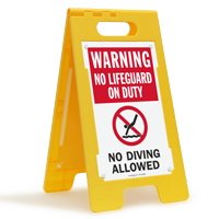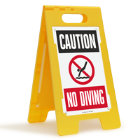 A. Designed to bring together high visibility and ultimate convenience, our readily portable “No Diving” FloorBoss signs are two-sided. The signs come as kits containing two sign panels and a lightweight yet sturdy yellow frame that the panels slide into. You may choose from standard and reflective panels to convey your message to passersby approaching from opposite directions.
