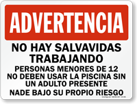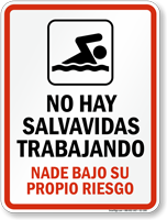 • • We feature a variety of Spanish and Bilingual No Lifeguard On Duty Signs that help limit your liability and encourage safe swimming and conduct in any public swimming area.