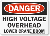 Yes, our high voltage overhead lower crane boom OSHA danger sign is one example of our equipment-specific options, and our customizable overhead power line sign templates let you specify voltage, required clearance distance, or site-specific safety instructions in durable materials with reflective versions available for improved visibility on outdoor job sites.