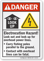 OSHA requires that workers be warned about overhead electrical hazards on construction sites, particularly when equipment operation near power lines creates a risk of contact, and our overhead power line signs are available in Caution, Warning, and Danger signal words appropriate to the voltage level present to help fulfill this requirement.