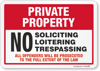 No soliciting signs are a great way to protect yourself from unwanted interruptions. Post a clear Private Property No Soliciting Sign outside your home or place of business to keep intruders away. Order any of our private property signs to ban loitering, trespassing, skateboarding, and more.