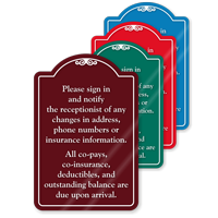 All our reception signs are professionally designed keeping in mind the varied needs of our customers. ShowCase™ Reception Signs are one of the most elegant office reception signage categories. Some bigger sizes in this category feature a dome top too. These acrylic reception signs are 125 mil thick and feature subsurface graphics and an elegant border with a motif on top. Not just for offices, but these glossy signs are ideal for apartments, hotels, schools, and hospitals, too, where aesthetics cannot be compromised. Signs are offered in four classic color options: Red, Forest Green, Blue, and Burgundy. White font and rounded corners elevate the professional look of these signs.