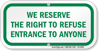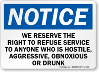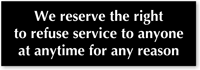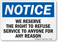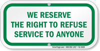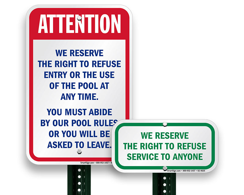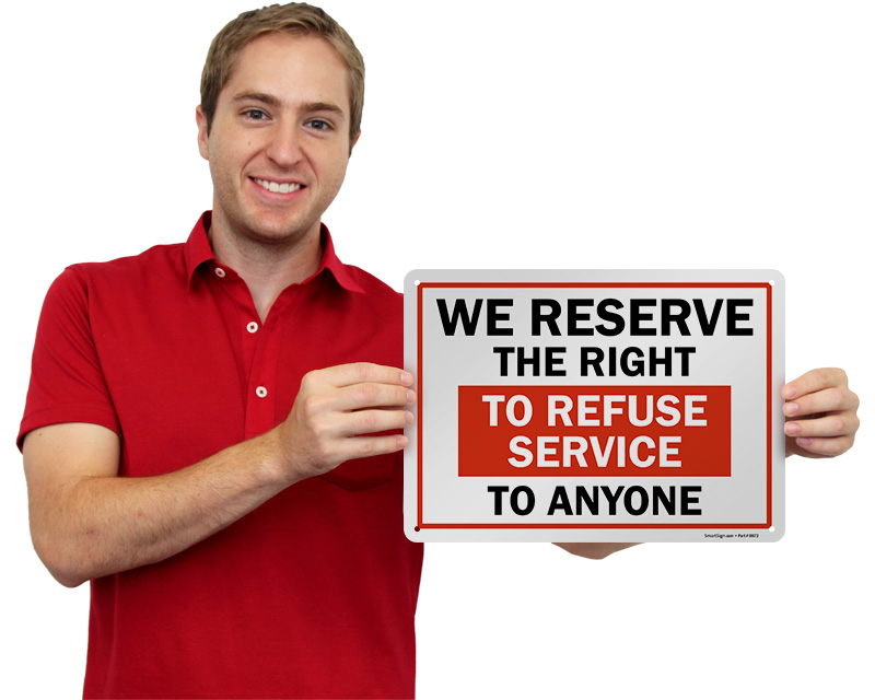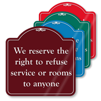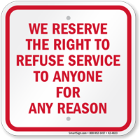 Tired of dealing with rowdy or troublemaking customers? Right to Refuse Service Signs give restaurants, stores, schools, clubs, and other service providers an authority to refuse their services to patrons, unless they are doing it on the basis of race, color, religion, or natural origin, which is against law.