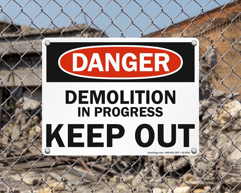 Yes, OSHA 29 CFR 1926.850 requires that demolition work areas be clearly marked and barricaded to prevent unauthorized entry, and our demolition in progress keep out OSHA danger sign and full demolition signs collection satisfy the hazard identification requirement for workers, neighboring property occupants, and the general public.