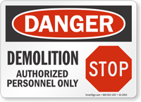 Our demolition warning signs are available for active demolition sites, implosion zones, structure removal projects, and building deconstruction areas in Danger and Warning headers in aluminum, rigid plastic, and reflective formats with pre-drilled holes for fast installation on fences, barricades, and temporary signage posts at site perimeters.