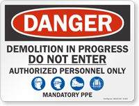 Demolition In Progress Signs keep your job site safe. Keep unauthorized people out of your site. Then, for authorized workers, define the mandatory PPE and other job requirements.