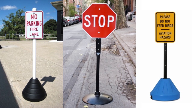 The portable Tip 'n' Roll sign bases has integrated wheels that allows to move t...