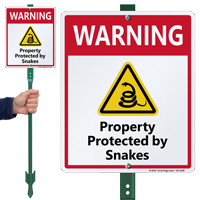 • • Unlike coiled snakes, brightly colored signs are hard to miss. Post signs to alert people and prevent unnecessary and dangerous snake bites.