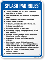 Common rules include: "no running" (slippery surface), "water shoes recommended," "do not drink the water," "swim diapers required," and "no soaps or shampoos." These are enforced with splash pad signs.