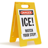 We carry FloorBoss stand-up floor signs made from durable, injection-molded polypropylene with reinforced ribbing for extra strength. Each kit includes a frame with an easy-grip handle and two thick, double-sided message panels. Panels can be permanently locked in place with included rivets or swapped out modularly - ideal for icy floors, construction zones, and temporary indoor hazard areas.