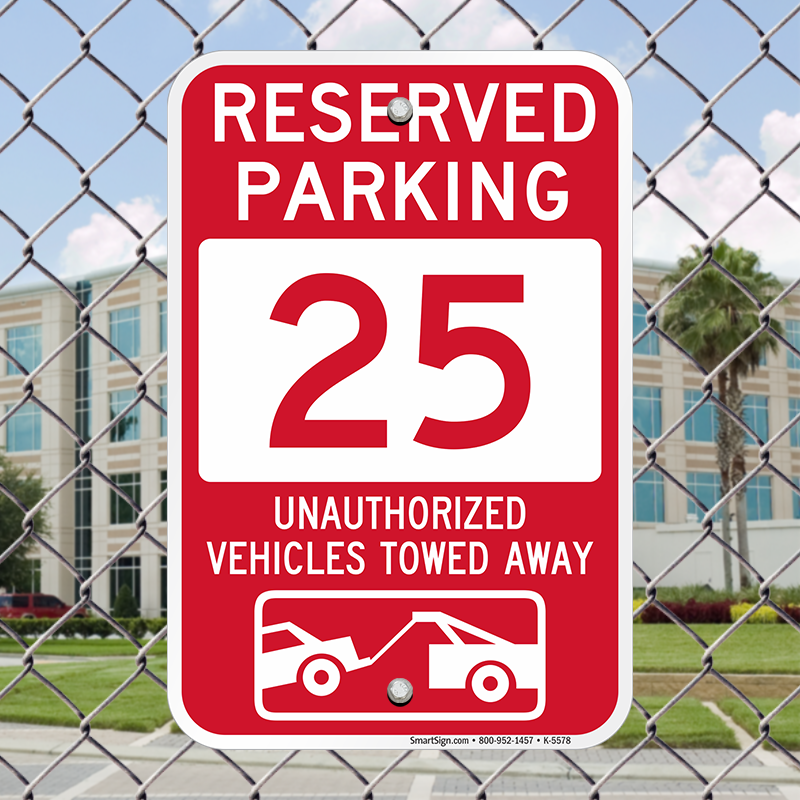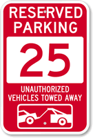 Reserved Parking Sign: Reserved Parking 25, Unauthorized Vehicles Towed Away (with Graphic) Learn More...